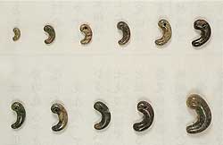 神宮には古代各氏族の王権を象徴する神宝を始め、大和朝廷の数を多くの神宝類が天神庫あめのほくらに保管されていました。その量ははかり知れないほどの莫大な量であったと考えられ、下って「日本後記」には、平安時代初期の延暦二十四(八百五)年に当神宮の器仗を山城国葛野郡に遷すのに十五万七千余人の人員を要したと記されています。しかし、中世以降衰退の一途を辿り、戦国時代の織田尾張勢の乱入や度々の盗難によって多くの宝物が散逸しました。 現在残っているものは少量ですが貴重なものが多く、古代の日朝関係を考察する上で不可欠な七支刀(国宝)を始め、鉄盾(重文)、足利尊氏奉納と伝えられる兜を具した色々威腹巻いろいろおどしはらまき(重文)更に禁足地発掘により出土した勾玉・管玉・環頭大刀柄頭等(重文)が神庫ほくらに収蔵されています。 尚、毎年大晦日には、神庫の守護神を祀り、その安泰を祈る神倉祭が斎行されてます。 鉄盾(重文) 七支刀(国宝) 硬玉勾玉(重文) 環頭大刀柄頭(重文)